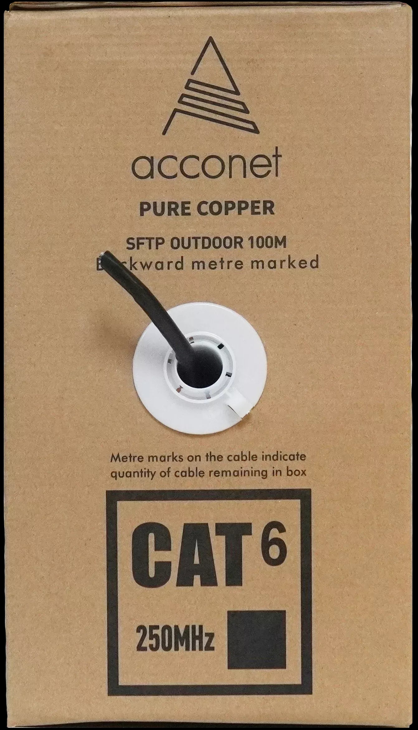 The Acconet CAT6U-100-SC is a 100-metre outdoor Shielded Twisted Pair (STP) ethernet/LAN cable with solid copper conductors. It features a black UV-protected jacket designed to resist degradation from sunlight and environmental exposure, suitable for outdoor installations. This CAT6 cable provides shielding against electromagnetic interference (EMI) and radio frequency interference (RFI), enabling Gigabit Ethernet applications and, over shorter distances, 10 Gigabit Ethernet for stable data transmission.