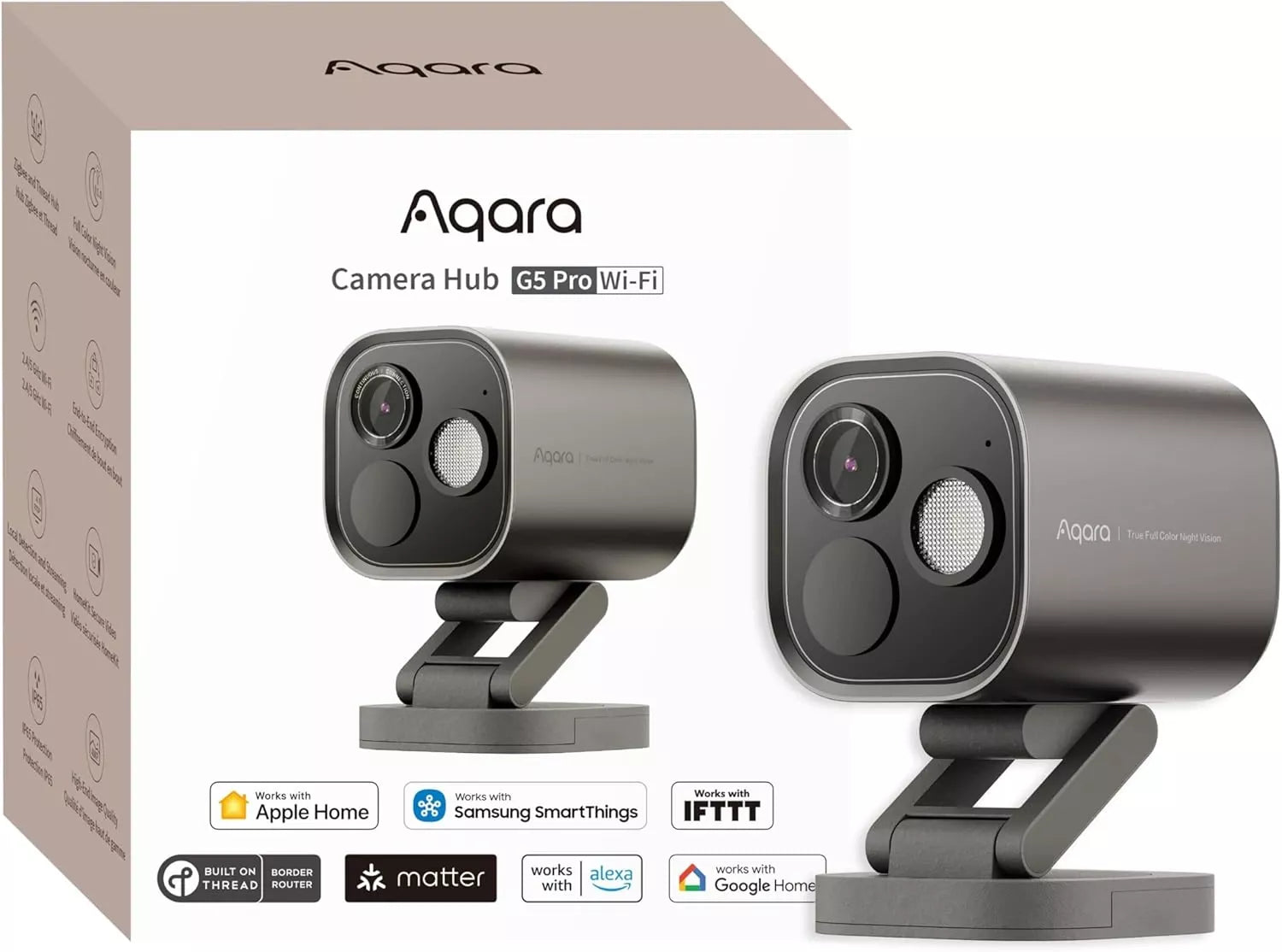 The Aqara Camera Hub G5 Pro CH-C07D-GRAY is a wireless security camera with an integrated smart home hub supporting Matter, Zigbee 3.0, and Thread protocols. It captures 2K (2304 x 1296) resolution video and offers a 152° wide-angle view with pan and tilt functionality (340° horizontal, 60° vertical) for extensive area coverage. Features include local AI-powered facial recognition, pet detection, and human recognition for precise alert filtering. The device supports two-way audio and offers multiple storage options, including local microSD card storage (up to 512GB) and cloud storage. It connects over Wi-Fi (2.4/5 GHz) and has a built-in privacy shutter, designed for indoor use.