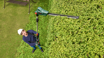 The UniversalHedgePole 18 is perfect for effortlessly trimming tall hedges. It features a height-adjustable, telescopic pole with a pivoting head providing a ladder-free, easy reach of up to 2.6 m. The Bosch Anti-Blocking System delivers a powerful and continuous cutting performance. It is lightweight (3.6 kg) and optimally balanced for comfortable handling. A powerful 18 V Lithium-ion battery provides up to 2.5 hours of continuous work, without the risk of cutting the power cable. The tool belongs to the POWER FOR ALL ALLIANCE. One battery can operate a large variety of tools from different brands.