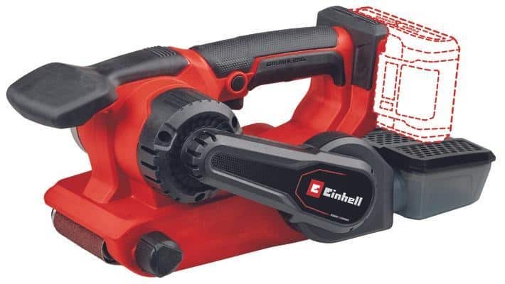 The Einhell cordless belt sander TP-BS 18/457 Li BL is an indispensable tool for any hobby workshop where wood is used. Sanding large areas quickly, evenly and while saving as much power as possible is what the cordless belt sander is made for. The 18 V device is part of the powerful Einhell Power X-Change family, where batteries, devices and chargers can be flexibly combined. Thanks to its 126 mm long and 75 mm wide sanding surface and a max. sanding belt speed of 250 m/min, the belt sander can sand large areas in no time. A powerful, brushless motor ensures maximum performance and a longer running time. The device is powered by the Einhell PurePOWER brushless motor. This brushless motor offers more power and a longer running time than conventional carbon brush motors. After registering online, the brushless motor comes with a 10-year warranty. With the help of the speed electronics, the power can be perfectly adapted to the material to be processed. A continuous running lock facilitates time-consuming work. For convenient handling, the cordless belt sander is equipped with a large handle and an additional handle with softgrip. Thanks to an integrated storage area, the device can also be used when stationary. The dust extraction in combination with the supplied dust collection box ensures that the workplace remains free of wood dust. Alternatively, suction devices, such as Einhell wet-dry vacuum cleaners, can be connected to the suction adapter. The belt sander can be used with 457x75 mm sanding belts. For the immediate start of the project, 3x P80 sanding belts are included in delivery. The sandpaper is easily changed and adjusted thanks to the tool-free adjustable sanding belt tension via locking lever and exact sanding belt adjustment. Delivery without battery – The cordless belt sander TP-BS 18/457 Li BL-Solo is delivered without a Power X-Change battery or charger. These are available separately, e.g. as a practical starter set.