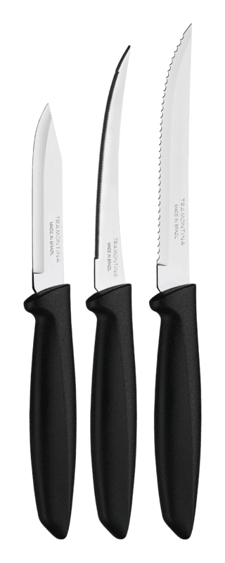 Ensure efficiency and quality when cutting food with the Tramontina Plenus 3-piece knife set with stainless-steel blades and black polypropylene handles. With it, you have the essential items to peel and cut the most varied ingredients with a high cutting power since the blades are made of heat-treated stainless steel. The handles are all in polypropylene and ensure greater strength and durability, in addition to comfortable, safe handling. All the pieces are easy to clean and dishwasher safe, maximizing your kitchen chores!