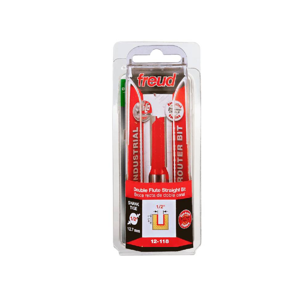 Freud's huge selection of carbide tipped and solid carbide double flute straight bits are ideal for grooving, edge-routing and other general purpose routing tasks. The precise hook and shear angles provide fast cutting and a smooth finish in hardwood, softwood, plywood and composite materials. Tips are relieved to allow for efficient plunge cuts. Designed for use in CNC, hand-held and table-mounted routers.
