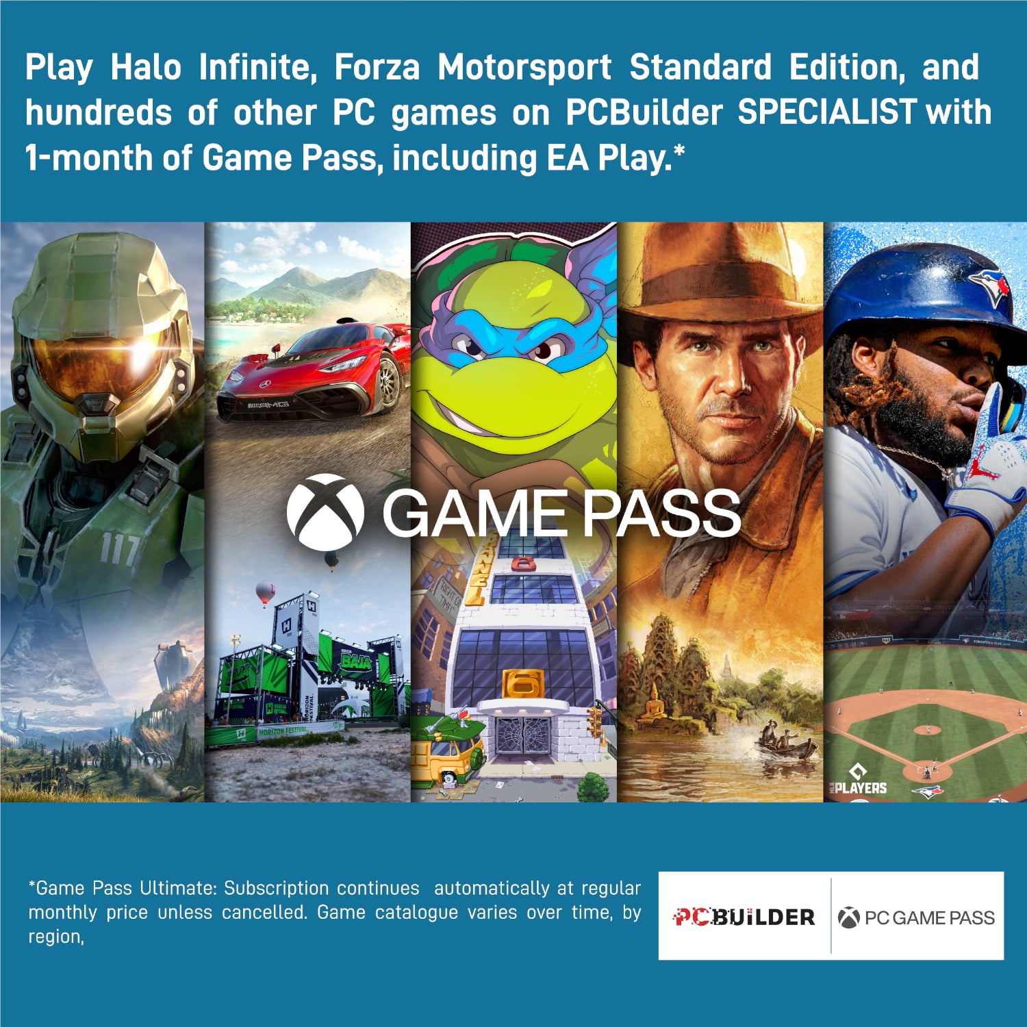 - Play over 100 high-quality PC games like Halo Infinite, Forza Horizon 5 and Teenage Mutant Ninja Turtles: Shredder’s Revenge with your new build and one month of PC Game Pass including EA Play. With new games being added all the time, there’s always something new to play from day one.