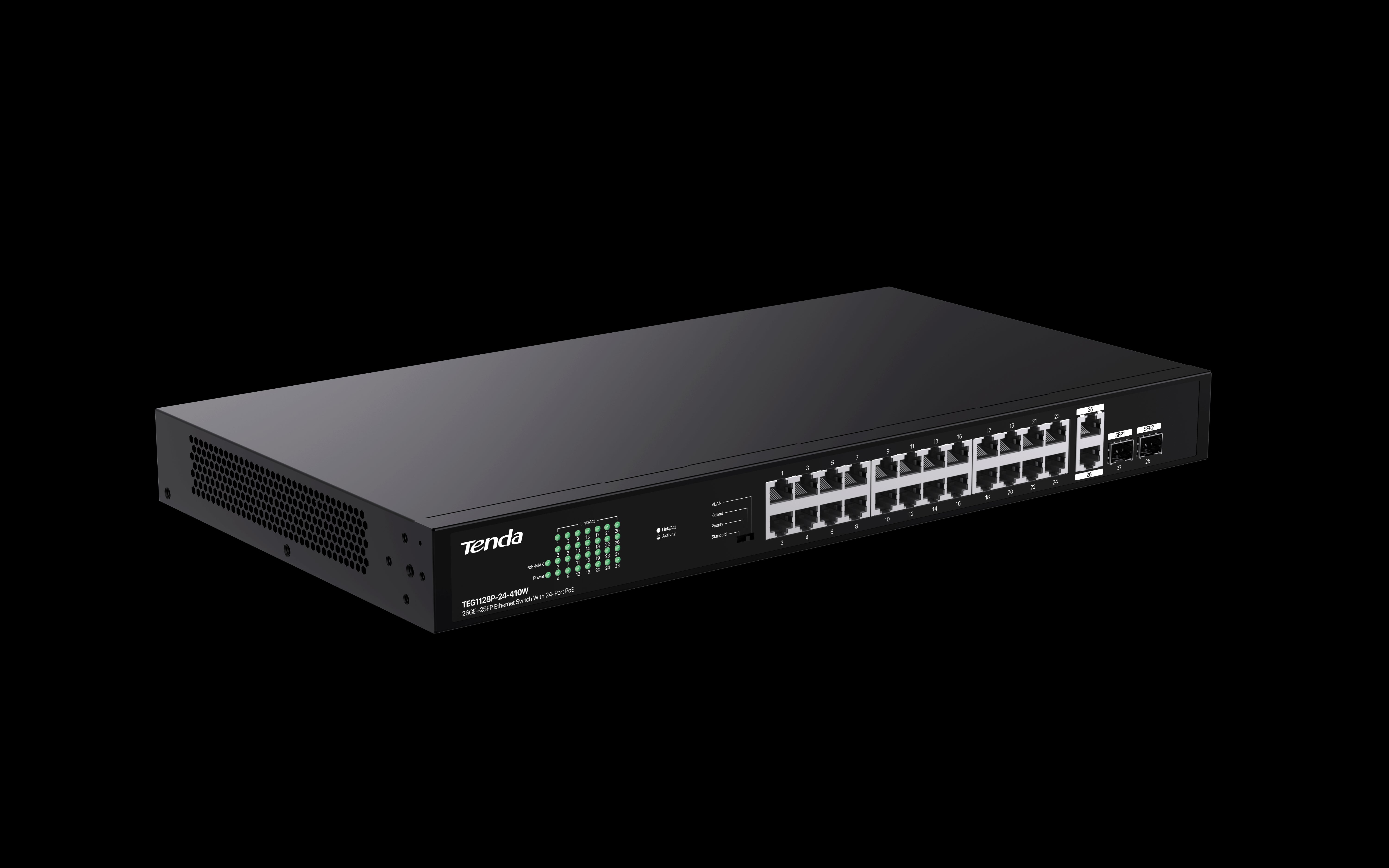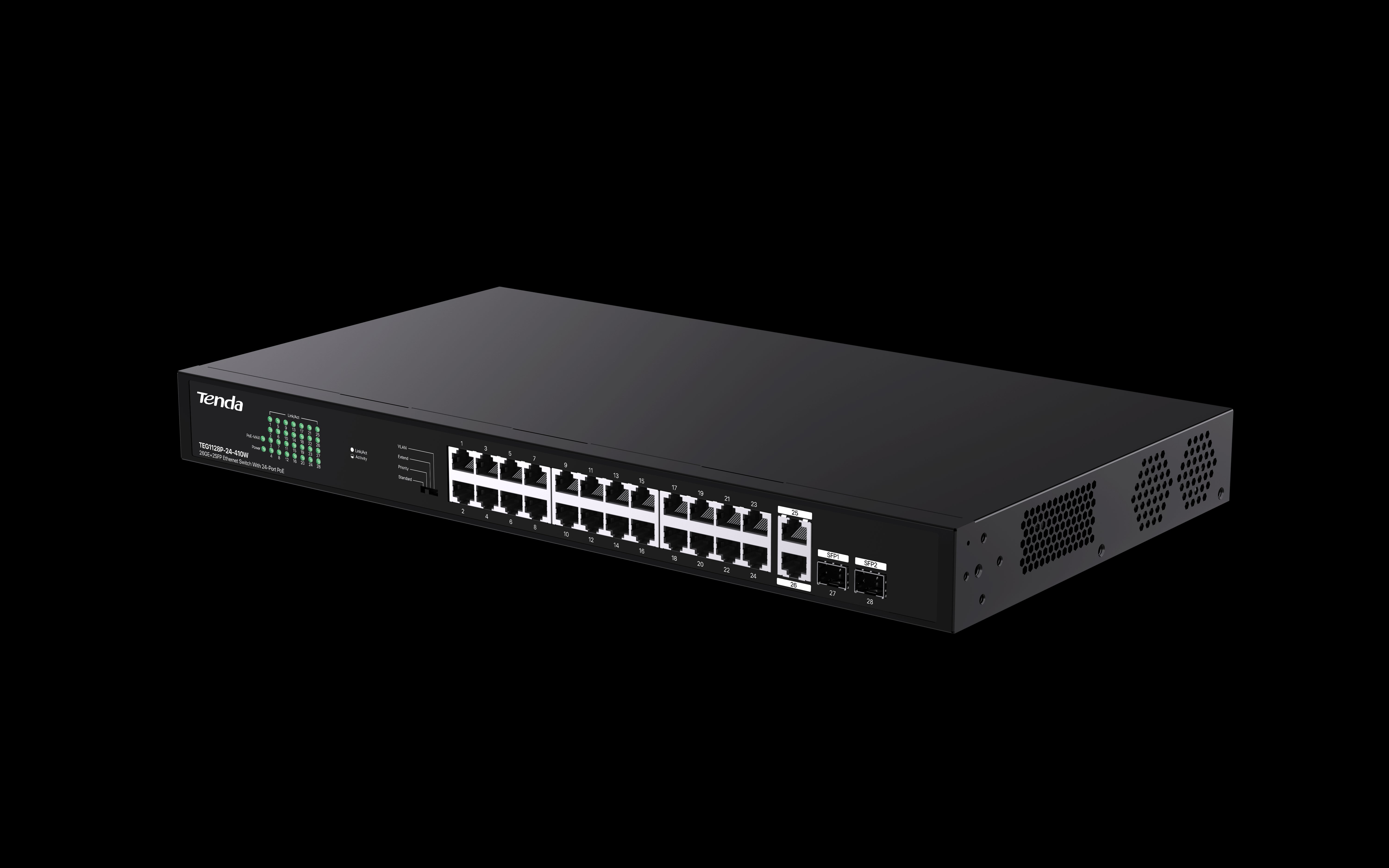 The Tenda 24 Gigabit PoE Unmanaged Switch has 2x uplink Gigabit RJ45 ports and 2x SFP ports. The TEG1128P-24-410W is a rack/wall mount Switch with unmanaged capabilities, has a power budget of 30W per port, to meet the demands of modern businesses, offering high-speed network performance with input voltage of 100-240V AC and has PoE power supply.
