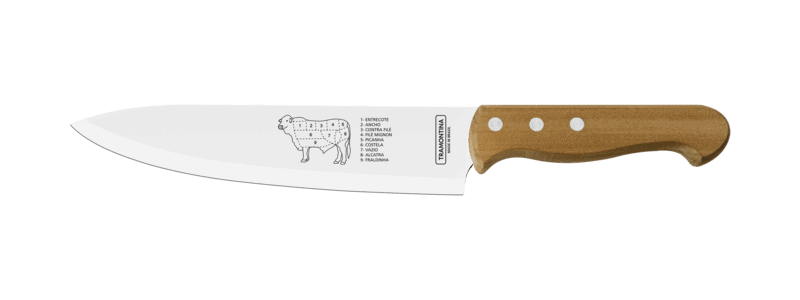 Churrasco Meat Knife With Stainless-Steel Blade And Natural Wood Handle 8" Warranty: 90 days for manufacturing flaws or defects. Knives blade with longer-lasting cutting edge due to heat treatment. Natural wood handle with aluminum rivets. With the Tramontina Churrasco 8-inch meat knife with stainless-steel blade and natural wood handle, serving your guests will be even more practical and tasty. With a stainless-steel blade, it ensures a longer-lasting cutting edge due to the treatment. In addition, the natural wood handle lends a sophisticated touch when serving. Your barbecue will be a success with this stylish knife.
