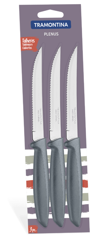 Steak And Fruit Knives Set 3 Pcs Warranty: Warranty against defects workmanship Stainless steel blades.Polypropylene handles. The Plenus line brings comfort and practicality together with items that have a light touch when serving and eating. In addition to a cheese kit, the line also offers flatware in five color options and knives for the most diverse types of cut. To do beautifully well every day.