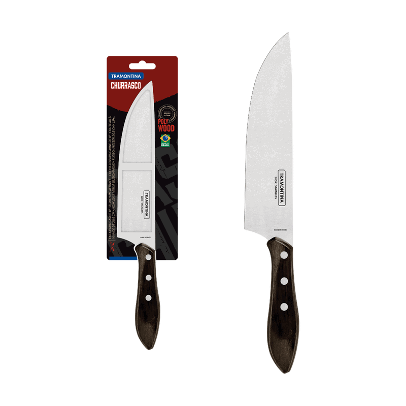 Meat Knife With Stainless-Steel Blade And Treated Brown Polywood Handle 8" Warranty: 5-year warranty against manufacturing defects (90-day warranty as required by law, plus 4 years and 9 months contractual warranty). The stainless-steel blade is thicker and features steel stamping that ensures greater resistance, preventing warping. The treated Polywood handle is resistant to impacts and high temperatures, ensuring greater strength and durability. Aluminum rivets. Dishwasher safe, it facilitates your daily routine. With the Tramontina 8-inch meat knife with stainless-steel blade and brown Polywood handle, you can prepare and serve the best cuts of meat. Its blade is made of heat-treated stainless-steel and provides excellent cutting power and durability for your daily routine. Its handle is made of treated wood Polywood, which in addition to being resistant to impacts and high temperatures, offers safer and more comfortable handling. A unique knife that will make your kitchen hours even more practical, as it dishwasher safe!