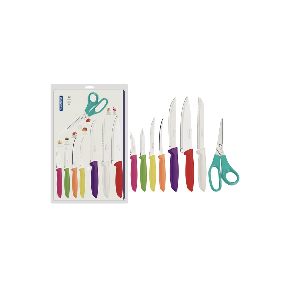 Plenus Stainless Steel Knife Set With Colorful Polypropylene Handles, 8 Pc Set Warranty: 90-day warranty against manufacturing defects. The stainless steel blades have a highly durable cutting edge due to special heat treatment. The polypropylene handles are highly resistant and durable. Dishwasher safe to make your daily routine easier. To make everyday life even easier, Tramontina's Plenus 8-piece stainless steel knife set is the best choice. With eight stainless steel knives, this set has polypropylene handles in various colors that are very comfortable to handle. The modern and colorful design will brighten up your days! In addition, they?re dishwasher safe, making your daily routine even easier.