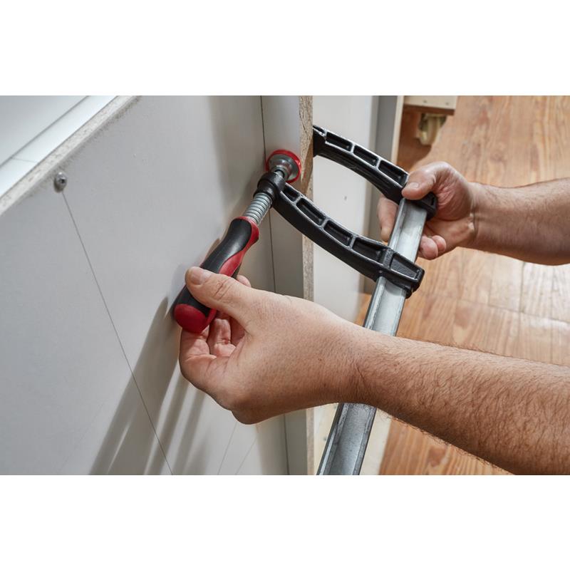• High-quality two-component plastic handle positioned around the rail, so clamp can be used in tight spaces
