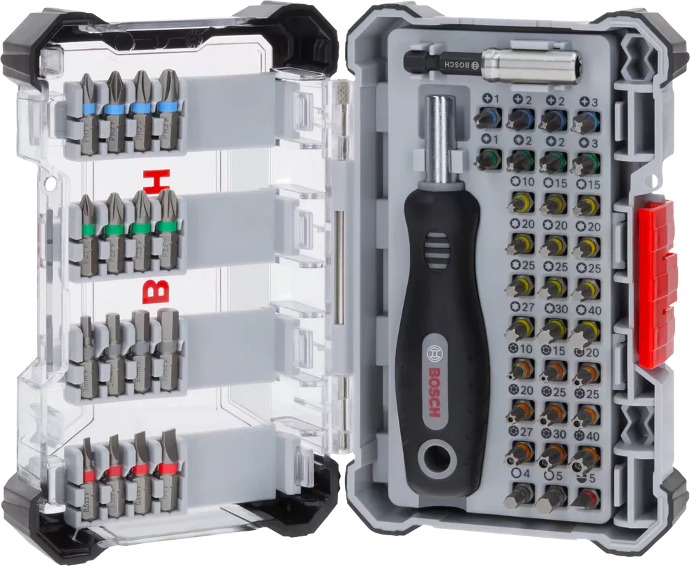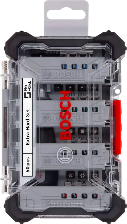 The Bosch Extra Hard Screwdriver Bit Set (50-Piece) is a robust Pick and Click solution for tackling all standard screwdriving tasks. Designed for professionals and DIYers alike, the set includes a wide variety of PH, PZ, TORX®, security TORX®, HEX, and slotted bits. The bits are crafted from extra hard steel for superior durability and are stored in a compact, customizable case. Ideal for use with rotary drills, impact drivers, or the included manual screwdriver handle.