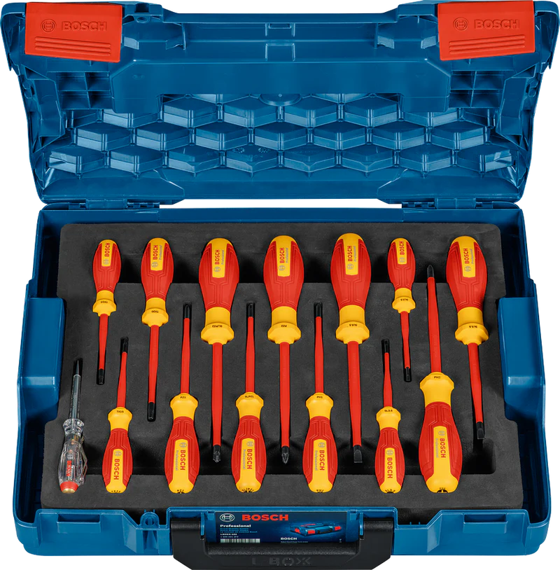 Efficiently manage your electrical work with the Bosch Professional VDE Screwdriver Set mixed 14pc SKU 1 600 A02 NF9. With a set of 13 VDE screwdrivers and a single-pole phase tester, this kit is ideal for working safely on live electrical circuits.