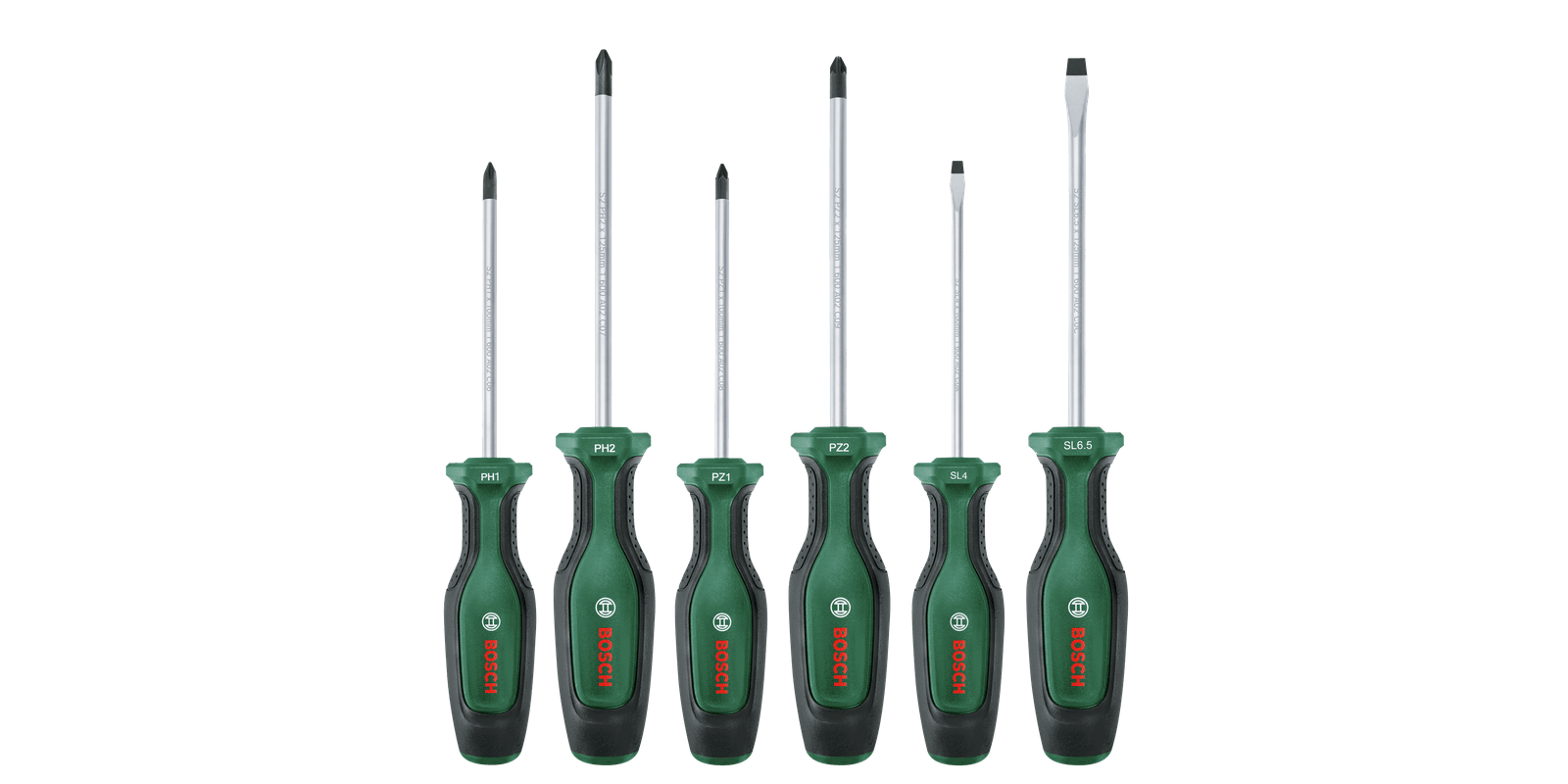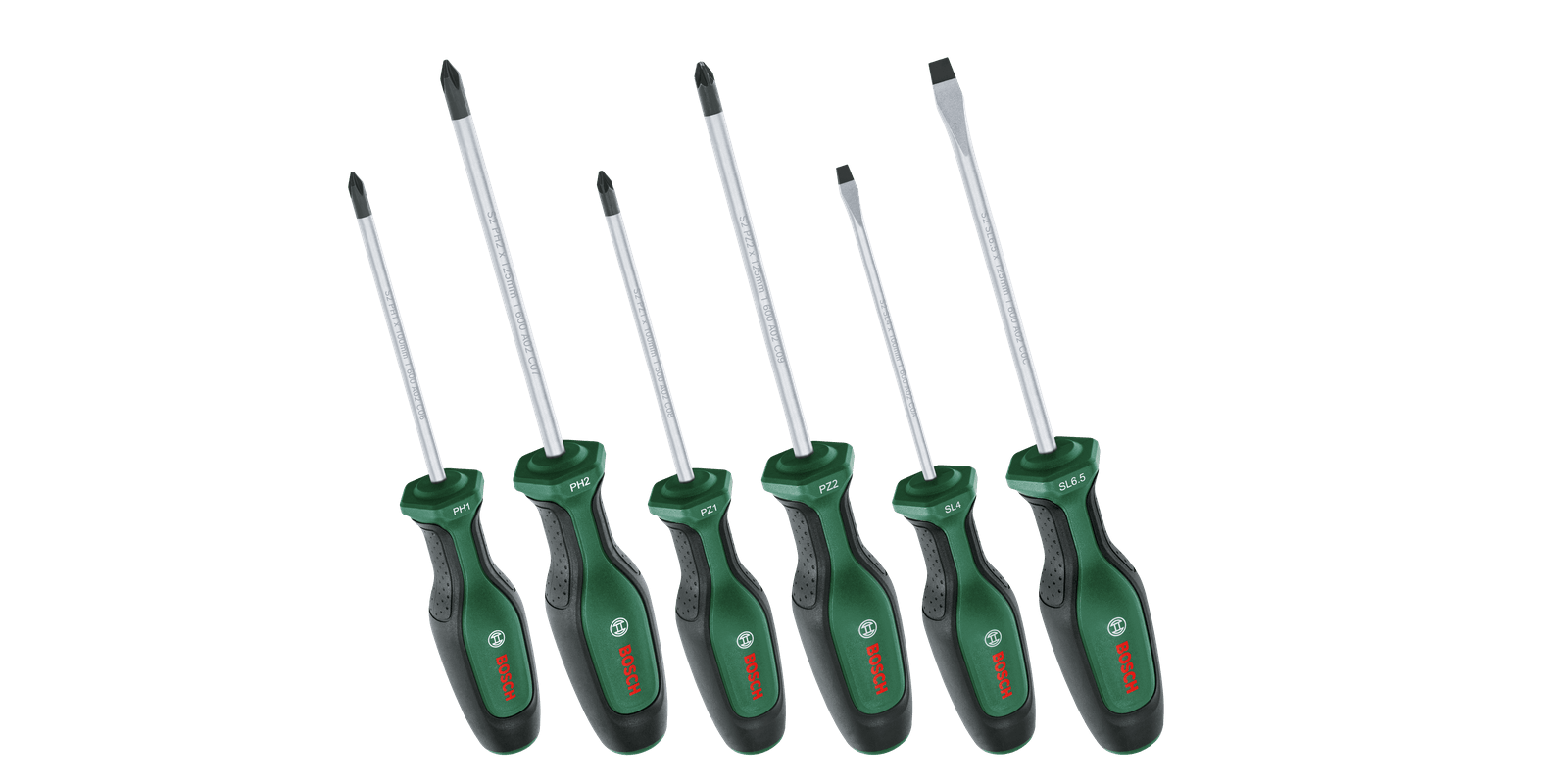 Get any fastening job done quickly and efficiently with a high-quality screwdriver from the Bosch screwdriver set. These screwdrivers are created with top performance and superior comfort in mind: each one is made of best-in-class, hard S2 steel, delivers a robust torque of at least 20% above DIN standard, and is ergonomically designed for optimal force. For stable screwdriving and a better visual contrast, the screwdriver tips are magnetic and coloured in black phosphate. The two-component handle has a soft grip for better handling and comfort, and at rest, the screwdrivers’ hexagonal form prevents roll-off. Which screwdriver for which job? That’s easy with the colour-coded size and shape indication on the tool handles for faster selection.