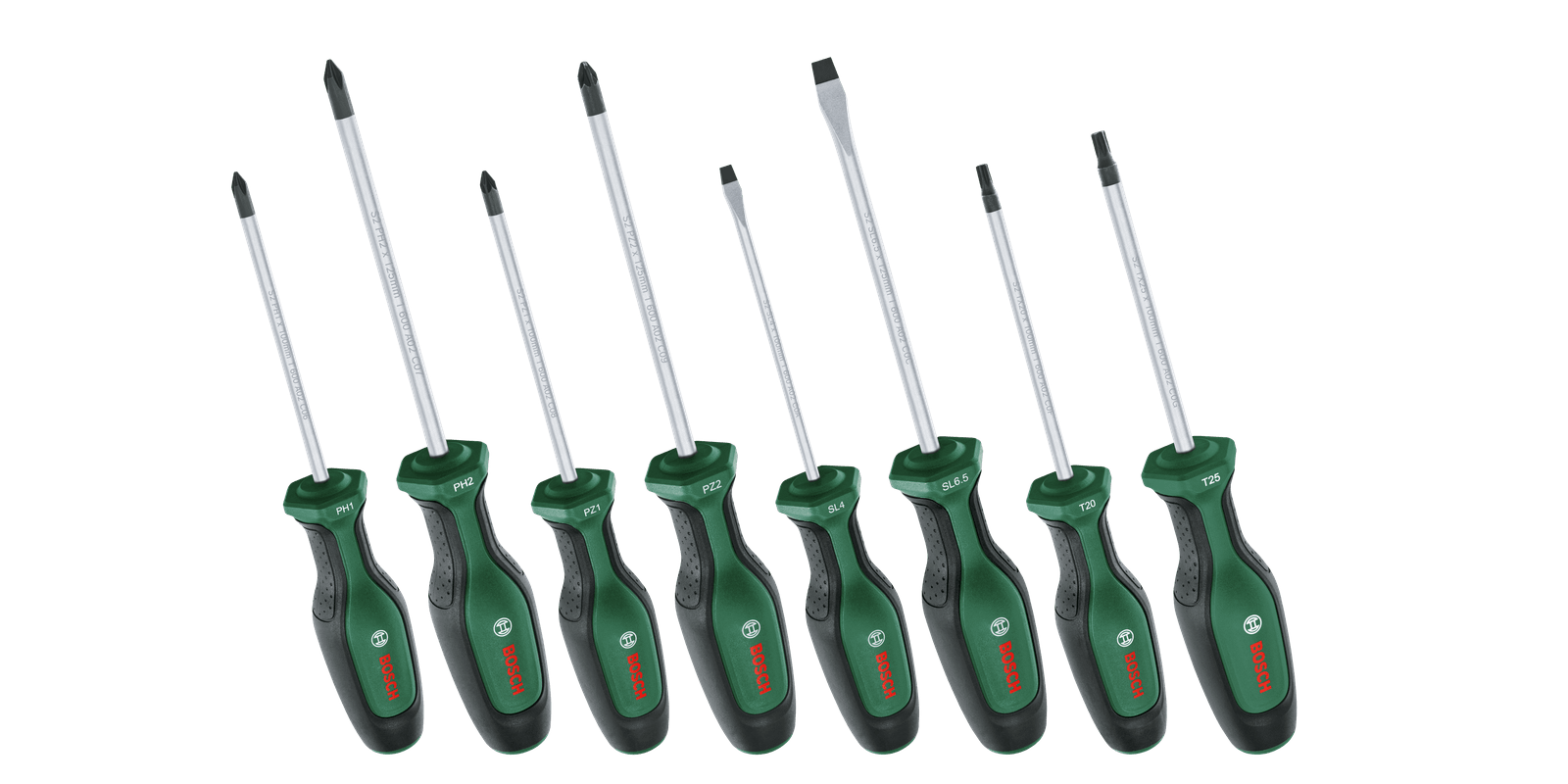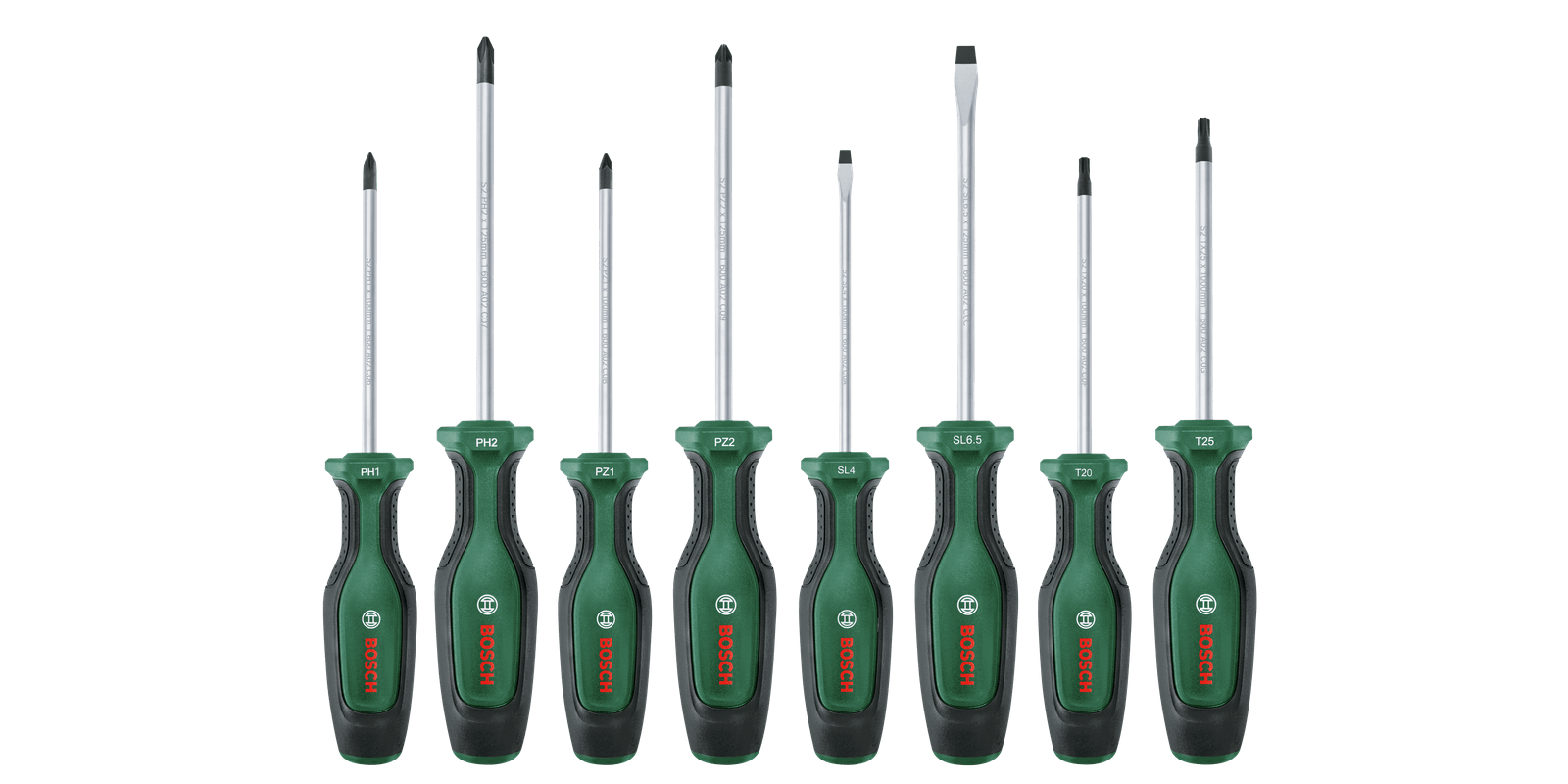 Get any fastening job done quickly and efficiently with a high-quality screwdriver from the Bosch screwdriver set. These screwdrivers are created with top performance and superior comfort in mind: each one is made of best-in-class, hard S2 steel, delivers a robust torque of at least 20% above DIN standard, and is ergonomically designed for optimal force. For stable screwdriving and a better visual contrast, the screwdriver tips are magnetic and coloured in black phosphate. The two-component handle has a soft grip for better handling and comfort, and at rest, the screwdrivers’ hexagonal form prevents roll-off. Which screwdriver for which job? That’s easy with the colour-coded size and shape indication on the tool handles for faster selection.