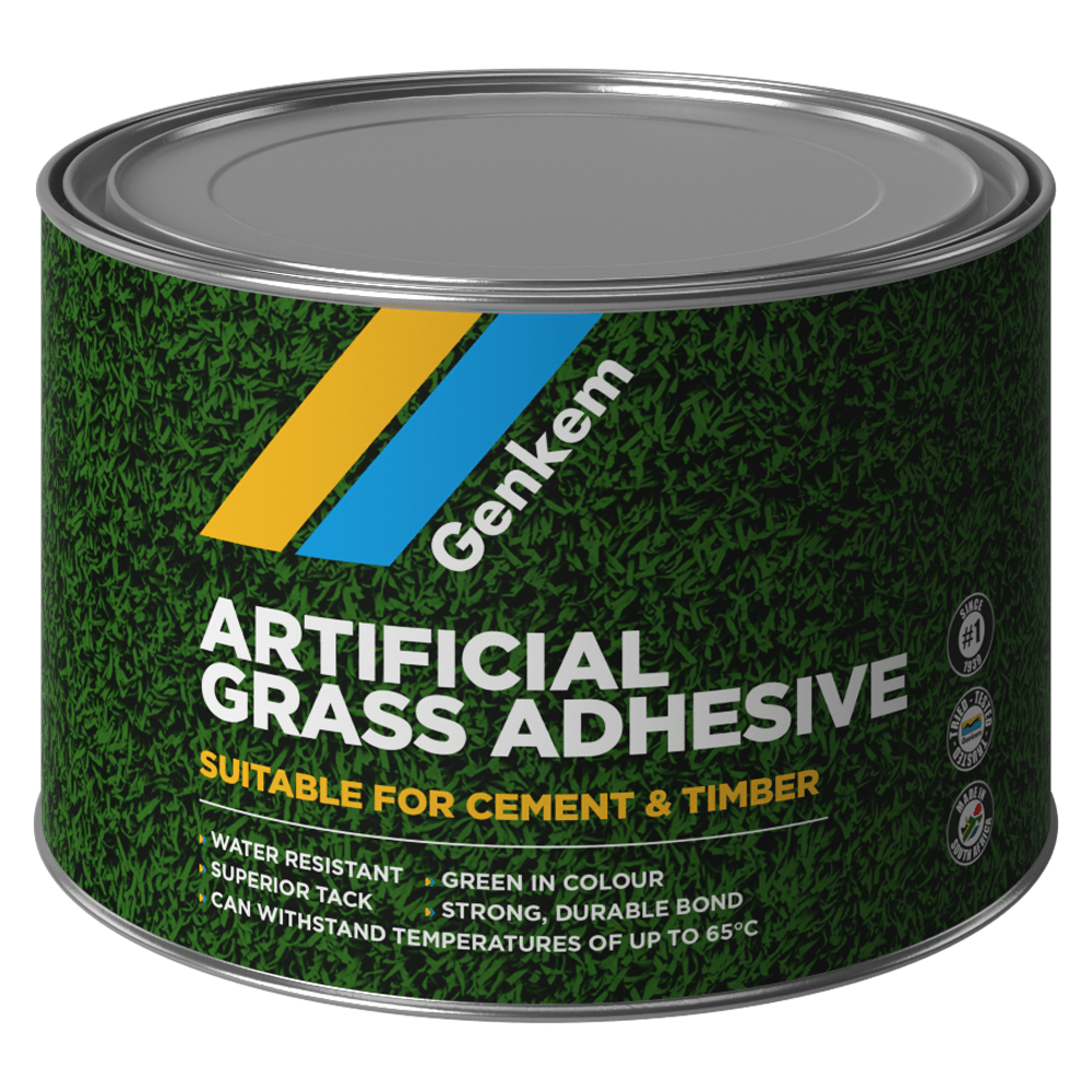 GEM0235 - GENKEM ARTIFICIAL GRASS ADHESIVE 2L \n \nGenkem Artificial Grass Adhesive is a solvent-based adhesive specially formulated for gluing artificial grass to concrete and timber, This product is water resistant and will withstand light rain after application. \n \nKEY FEATURES \n