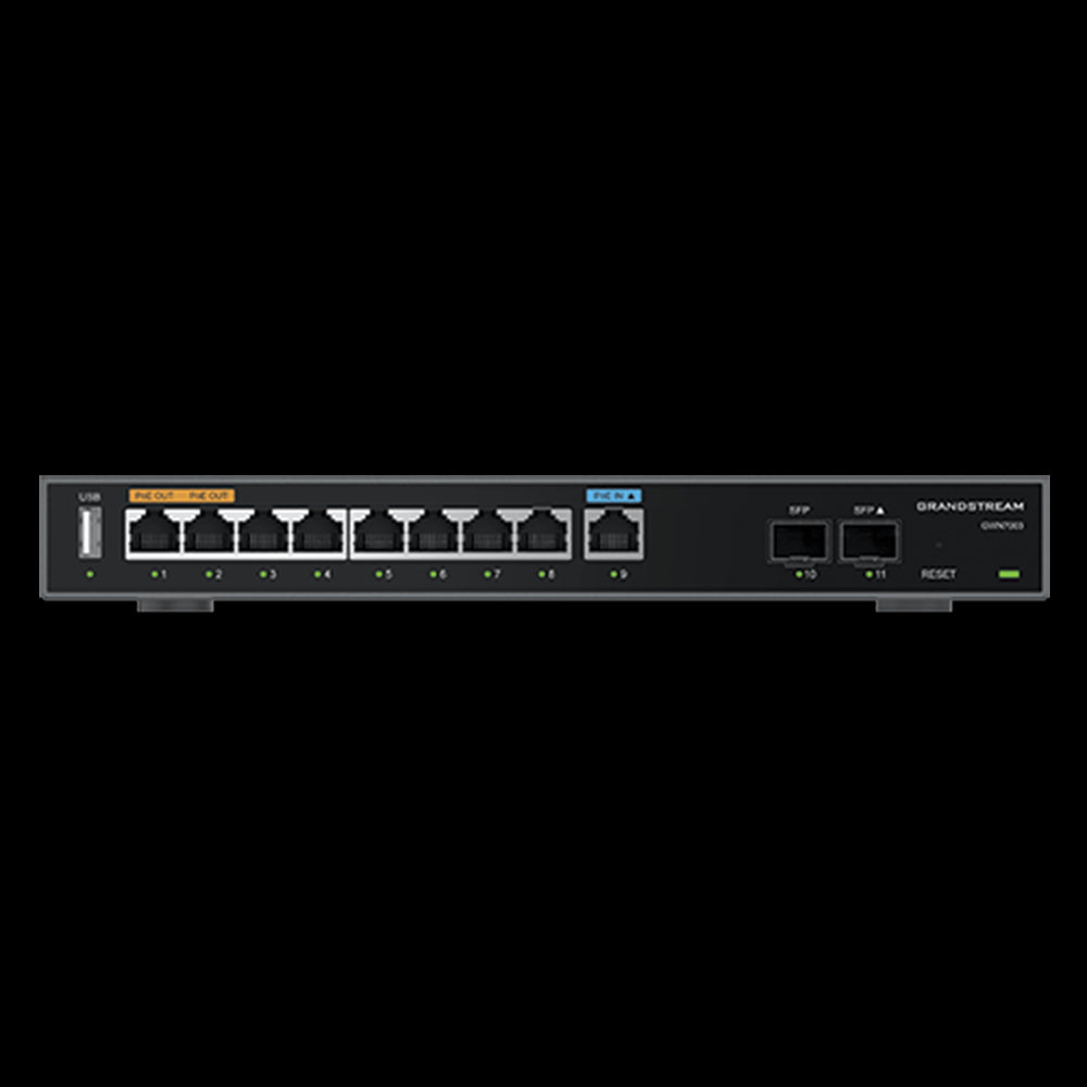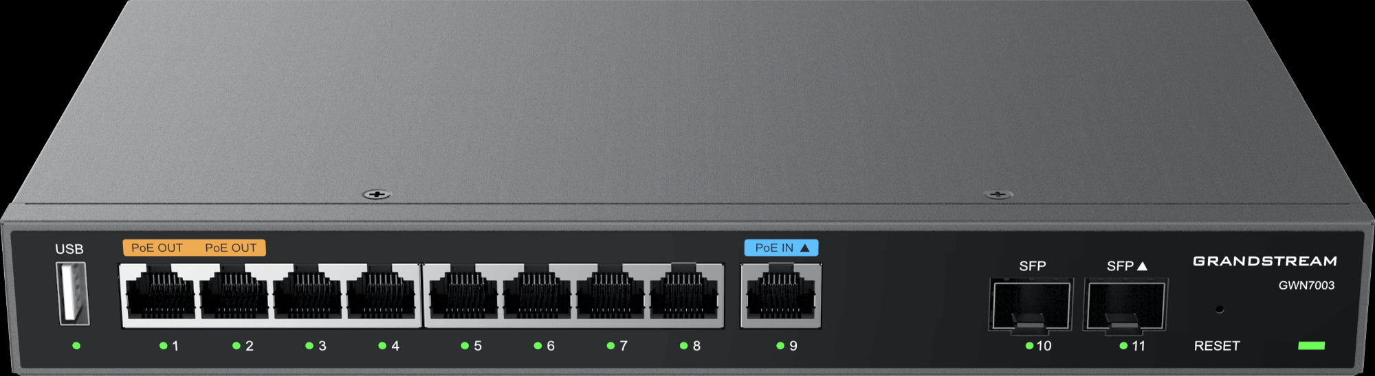 The GWN7003 is a 9-port Gigabit VPN router designed for small to medium-sized business networks. It features one PoE input and two Gigabit PoE output ports for efficient and flexible connectivity. The router supports key functions such as VPN, firewall protection, load balancing, and failover to maintain secure and continuous network operation. Enhanced performance is achieved through advanced Quality of Service (QoS) and deep packet inspection (DPI). Manage up to 150 Grandstream access points locally, or scale easily using the cloud-based GDMS platform for centralised network administration.