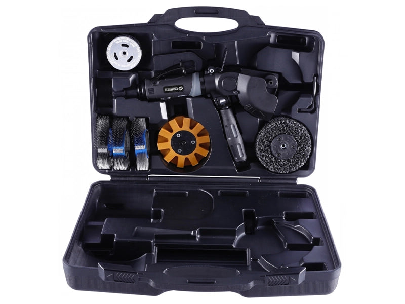 Rated 0.5 HP powerful air motor Innovative 180° rotational handle for precise leverage and control Unique double-side safety guards and integrated dust extraction system for safe and clean operation Planetary gear system reinforces the high torque Ergonomic cushion grip insulates against cold and vibration Swivel exhaust outlet in rear of tool allows easy operation Paddle-style trigger for precise speed control Increase the baffle and prevent hands from being injured