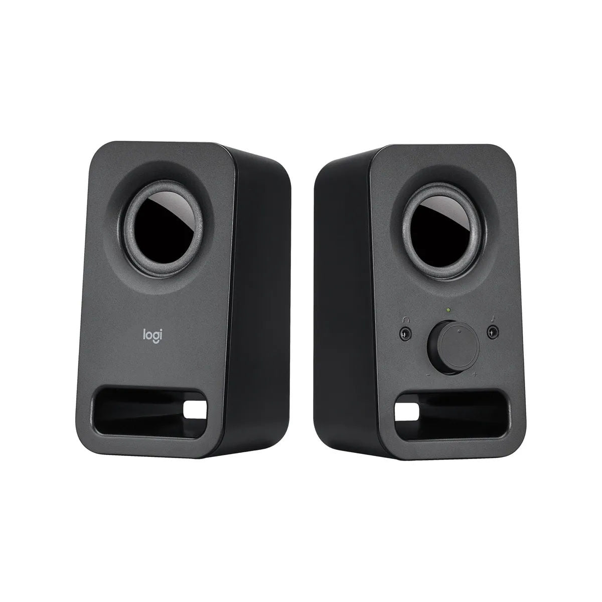 Logitech Compact stereo speakers with 6W peak power. Dual input (3.5 mm + aux) for connecting two devices. Front-facing volume and headphone jack.