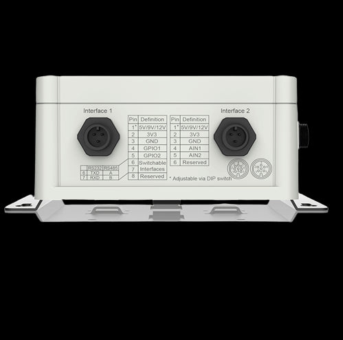 The Milesight NON LTE UC502 controller has an internal antenna, 2x GPIO interfaces, 1 RS232/RS485 (switchable) interface with 2x analog inputs, and 2x 3.3V outputs.