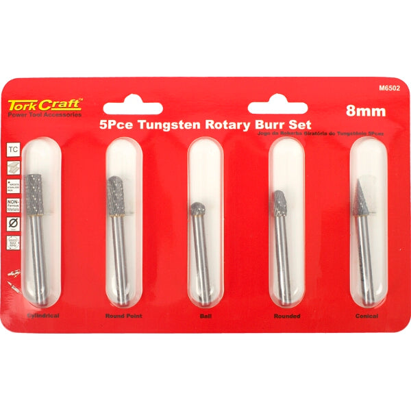 The Tork Craft Rotary Burr Set, standard double cut Tungsten carbide cutters. For use on pneumatic die-grinders Á electric die-grinder, for cleaning welding seams, de-burring, grinding Á shaping. For cutting steel, stainless steel, cast iron, high alloy steels Á brass. Operating speed 65000RPM Max.
