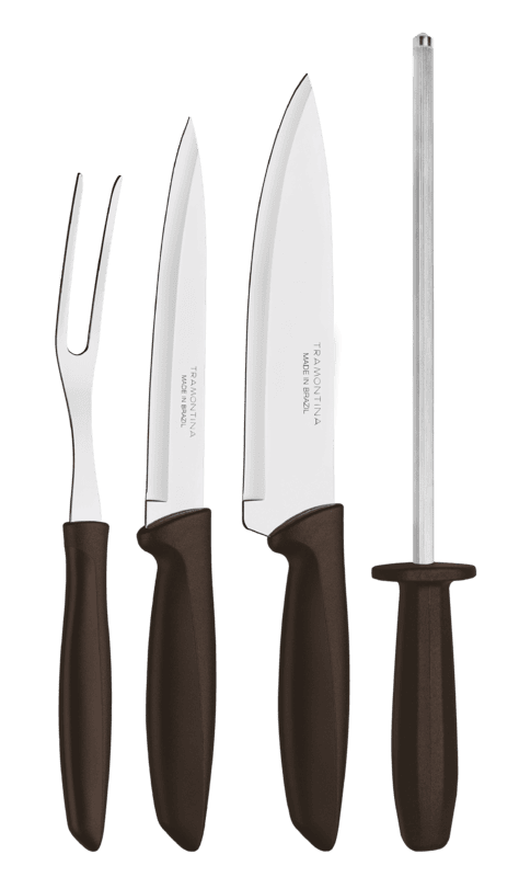 Plenus 4-Piece Barbecue Kit With Stainless-Steel Blades And Brown Polypropylene Handles Warranty: 90-day warranty against manufacturing defects. The stainless-steel blades of the knives have a longer-lasting cutting edge due to heat treatment. The sharpener features a chrome-plated carbon steel rod that ensures greater durability and sharpening precision. The polypropylene handles are stronger and more durable. Dishwasher safe, they facilitate your daily routine. The Tramontina Plenus 4-piece barbecue kit with stainless-steel blades and brown polypropylene handles is perfect for serving your family a tasty barbecue. With blades made of stainless steel, the pieces offer enhanced quality and strength because they are heat-treated. The sharpener features a chrome-plated carbon-steel rod to always maintain a good cutting edge for your knives. In addition to making environments more beautiful with their brown polypropylene handles, they are also easy to handle and lightweight. Tramontina has everything to make your moments much tastier!