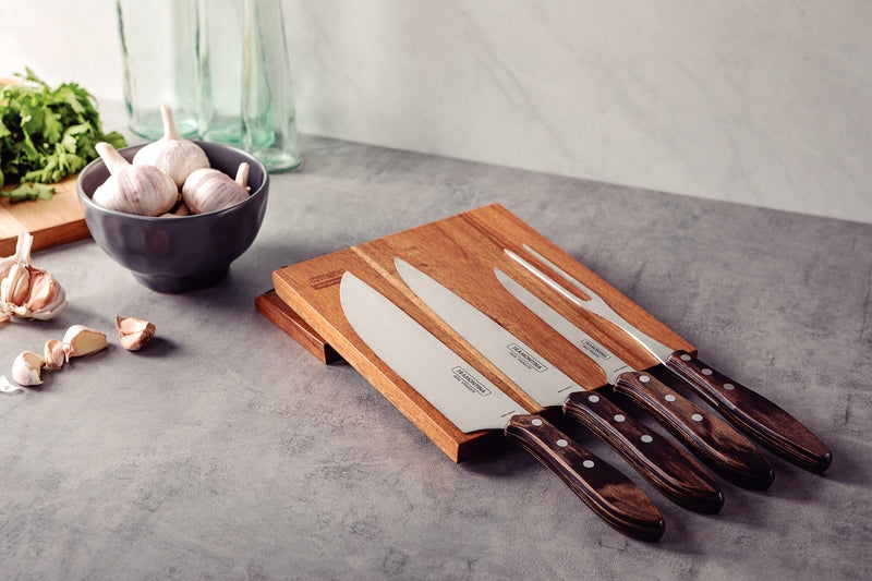 Prepare the best barbecues with more style and ease with Tramontina's 5-piece stainless steel barbecue set with brown Polywood handles. Perfect for slicing and serving the best cuts of meat, this set comes with the essential tools for preparing and serving a good barbecue - carving knives, a boning knife, a carving fork and a magnetic knife holder. These items have stainless steel blades and treated polywood handles, features that make this a high-quality and resistant set. A must-have item for your home.